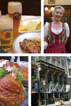 オクトーバーフェスト6醸造所のひとつパウラーナービールを楽しむなら、こちらがおすすめ。マリエン広場に1450年に創業した古くから続くビアレストランで、創業当時から変わらぬ伝統を重んじながら、訪れる人々にあたたかく迎えてきました。その一方で、2009年に建物を改装し、壁面に歴史的な絵や快適な照明を設置しました。ここに来たらやはり、バイエルン地方の料理とビールで舌鼓。ミュンヘン名物の皮をむいて食べる白ソーセージ(ヴァイスヴルスト 4.8ユーロ)は、食べ方が分からない場合はスタッフが親切に教えてくれます。レバーケーゼという見た目はレバーソーセージでもレバーが入っていない不思議なネーミングのメニューは、ビールによくあい8.9ユーロ。入口にはその日のデザートを紹介するショーケースがあるので、食後にゆったりと楽しむのもいいでしょう。