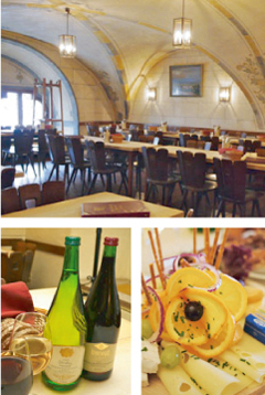 レジデンツの一角にある1950年設立の本格派ワインレストラン。ホールとプライベートルームがあり、バイエルン王国時代の王室が使用した部屋も。とはいっても堅苦しいことはなく、リラックスして食事が楽しめます。ワインセラーには数万本が常時保管され、おいしいドイツ産のワインをグラスで2.4ユーロ位〜と、お手頃な値段で堪能できます。お店のおすすめのワインはワイン街道にあるファルツ産のものが多く、写真はRiesling(リースリング・白ワイン)とDornfelderのROTWEIN(ドルンフェルダー赤ワイン)。おつまみは、ゲミッシュター・ケーゼ チーズの盛り合わせ(9ユーロ/2人)や、本場のプレッツェルを。また、新鮮な果物のジュースやコーヒーなどもあるので食後のひとときに。